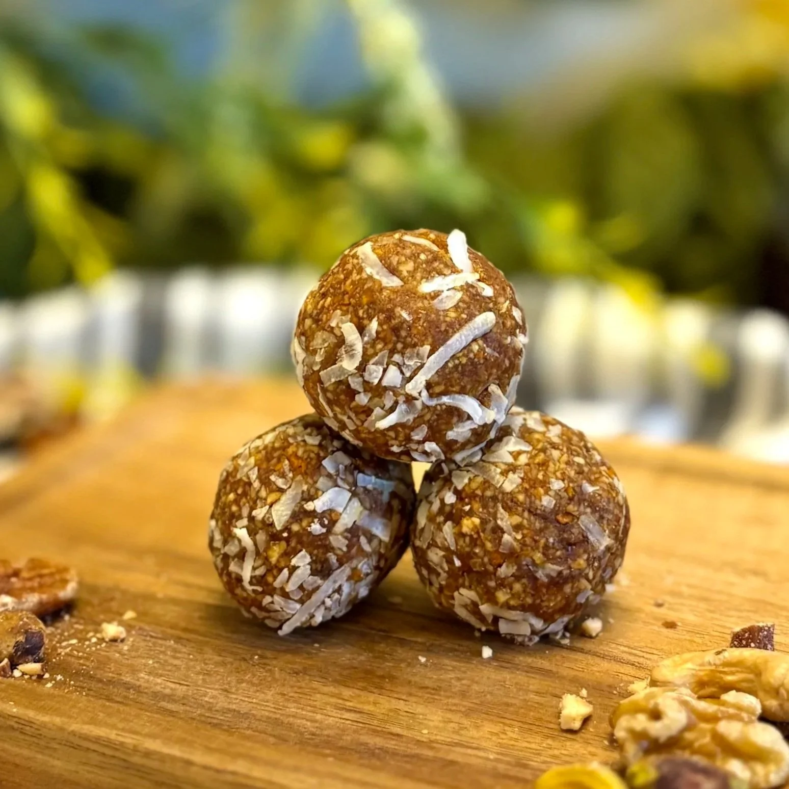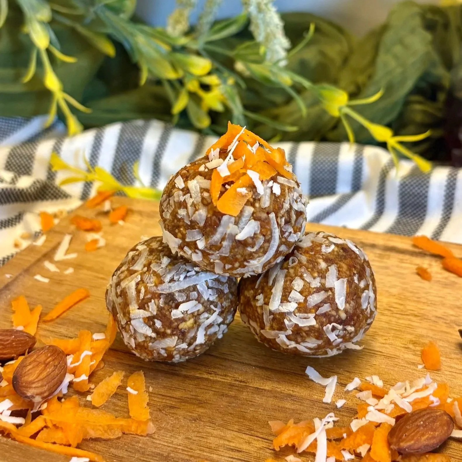 Dates, almonds, carrots, cinnamon, nutmeg, coconut oil, coconut flakes