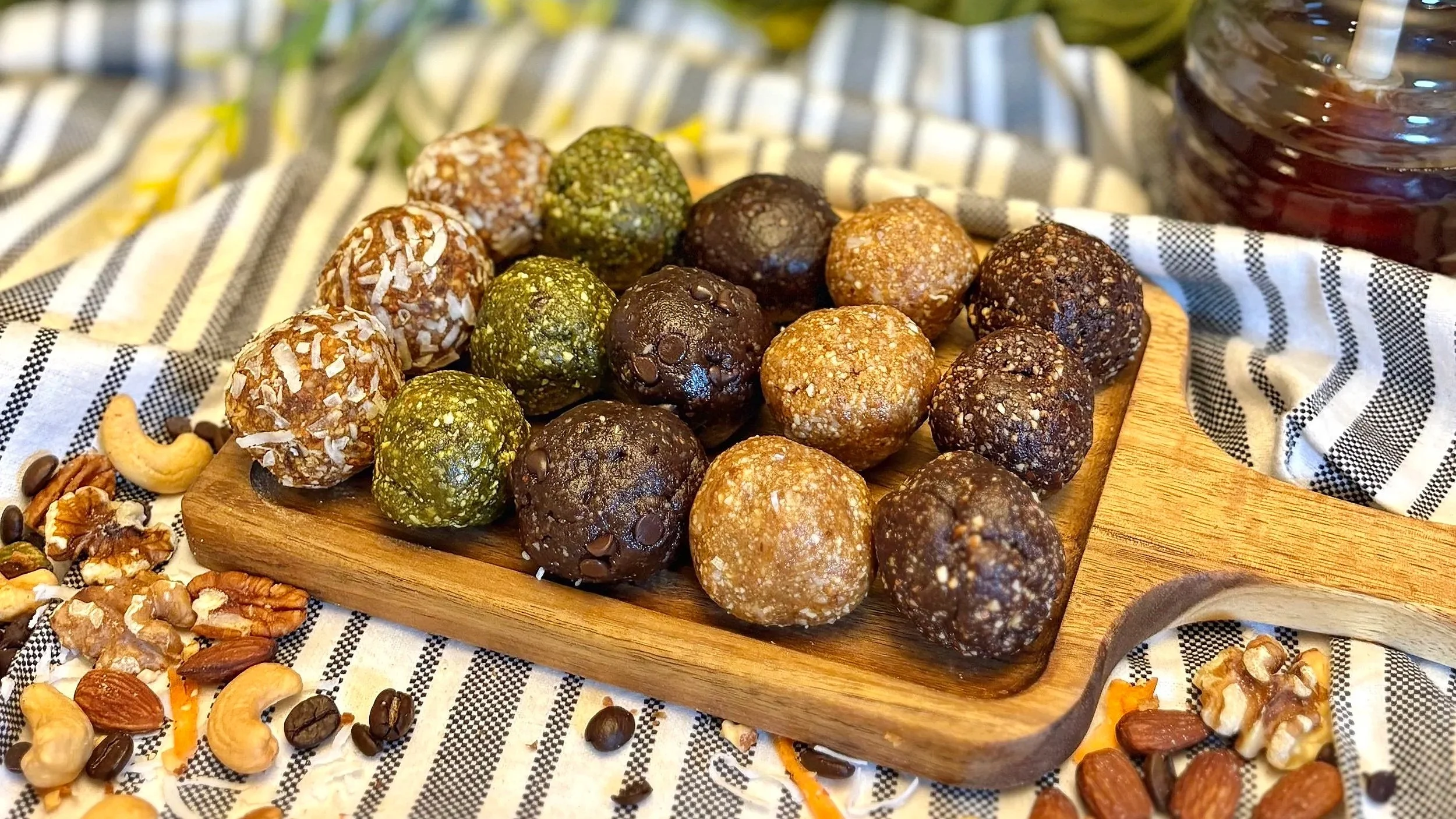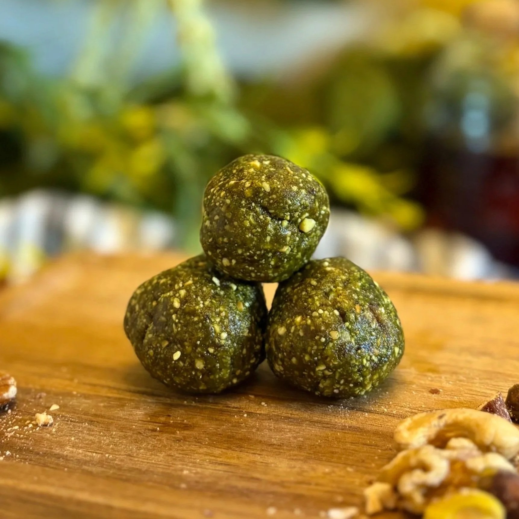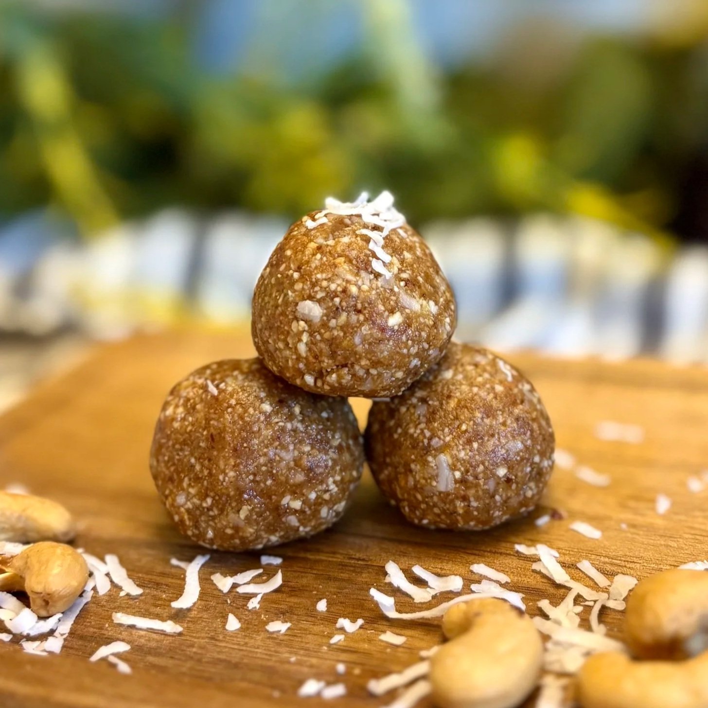 Dates, cashews, matcha powder, coconut oil, coconut flakes, vanilla