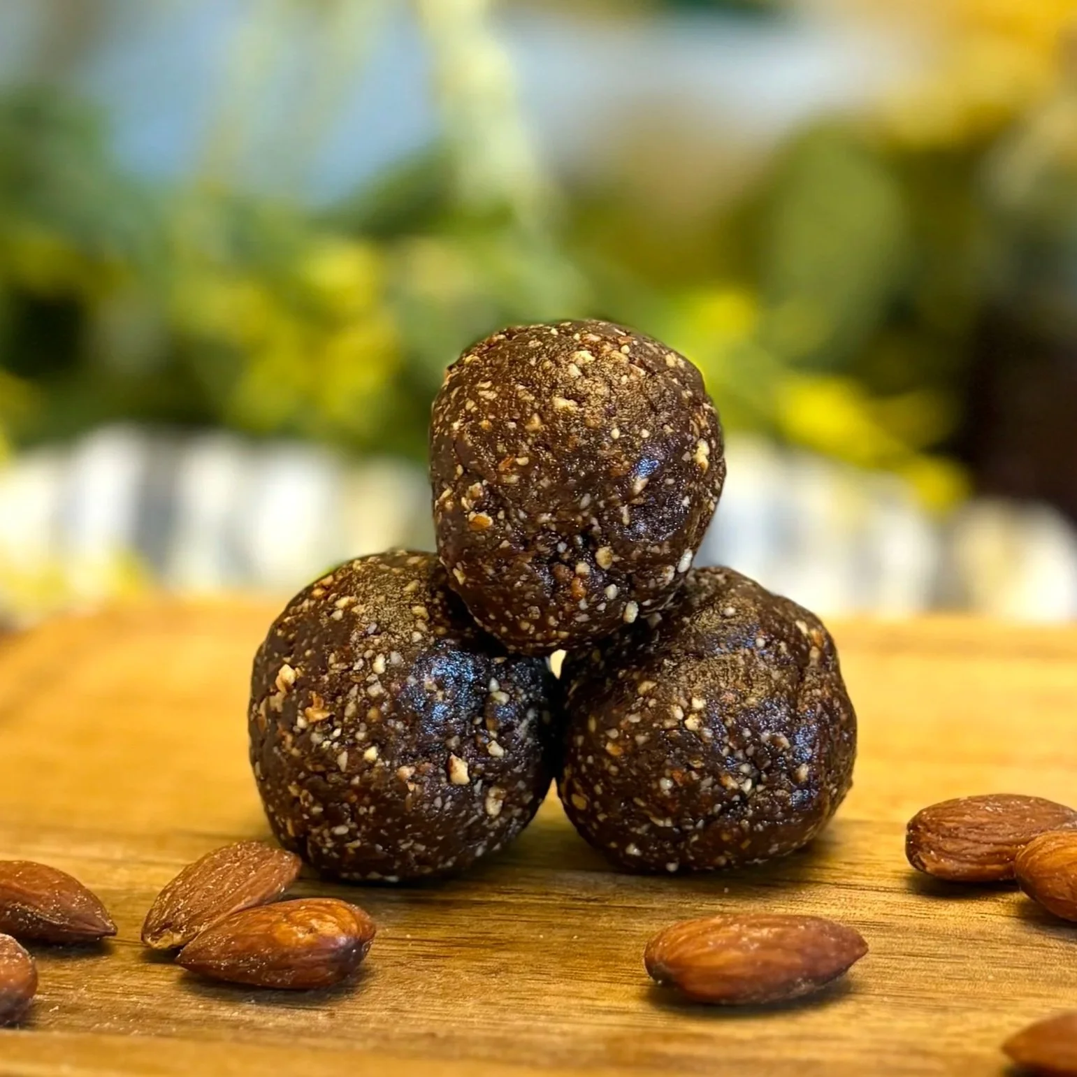 Dates, almonds, lions mane mushroom powder, cocoa powder, almond butter, vanilla, honey